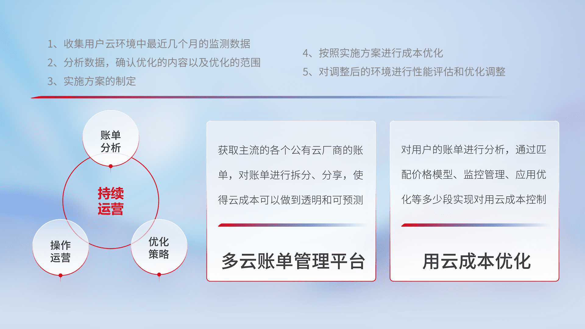 通过多云纳管,,以统一的资源数据模型把客户的云资源进行抽象和封装,,,进而实现对多云资源的统一操作,,保障云资源管理的可靠性、、稳定性与可用性。。。。量身定制化运维内容,,配置、、、开发运维、、补丁管理、、、备份、、、、监控、、认证和访问管理、、、审计和日常巡检等,,保障在用云过程中的可靠度,,稳定度以及高可用率。。。